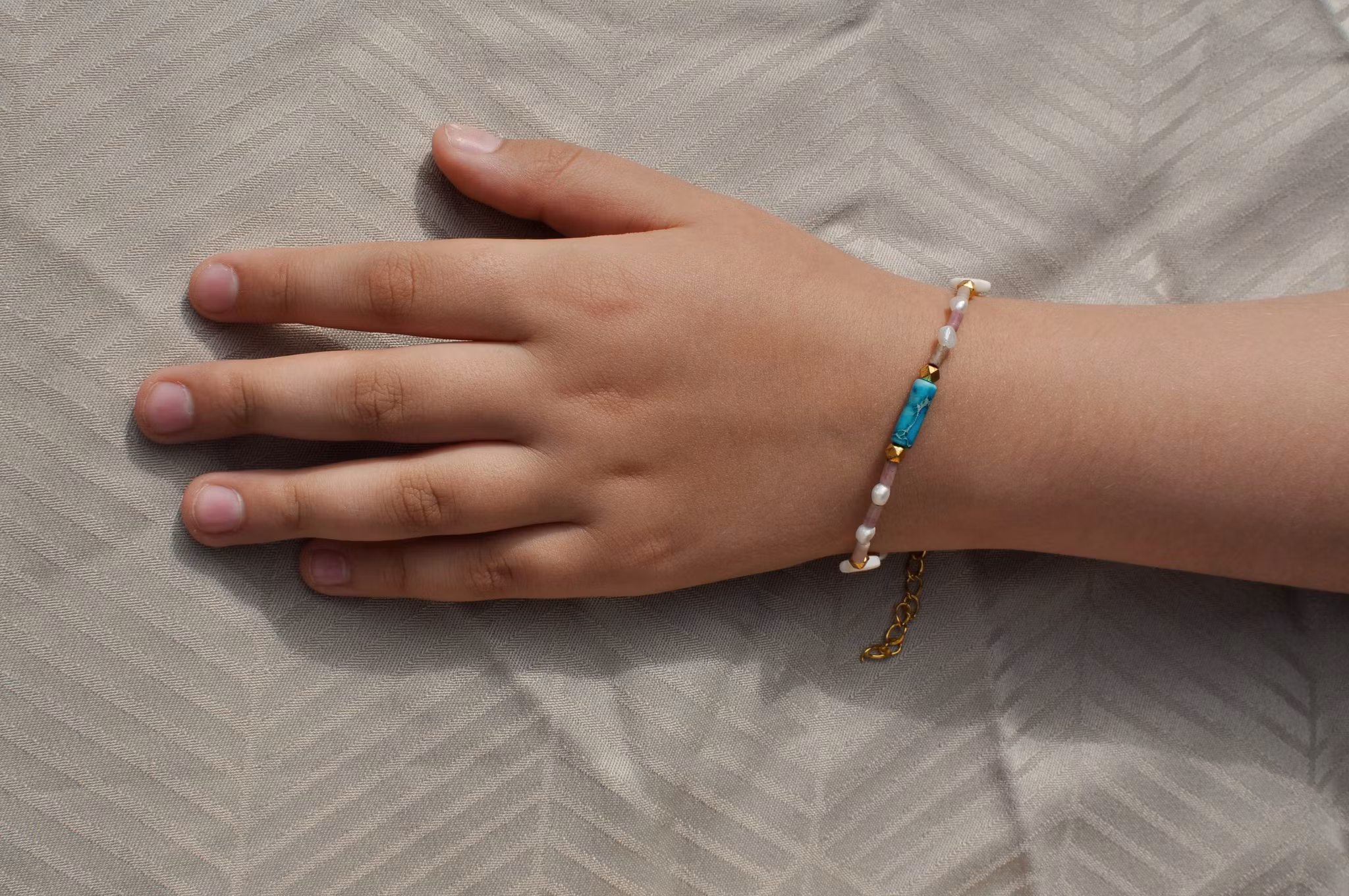 Armbåndet er laget med omtanke for både skjønnhet og holdbarhet. Den solide låsen er av gullbelagt rustfritt stål, og perlene er tredd på en vannfast, forgylt wire som tåler aktiv lek og hverdagsliv.